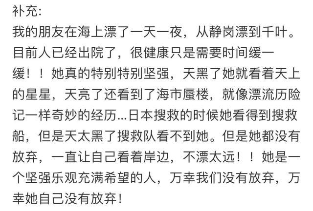 7月10日下午,疑似该女子的朋友发文确认,朋友已被救起。文中,该用户表示:“目前人(女子)已经出院了,很健康,只是需要时间缓一缓。她真的特别特别坚强,天黑了她就看着天上的星星,天亮了还看到了海市蜃楼,就像漂流历险记一样奇妙的经历……日本搜救的时候她看得到搜救船,但是天太黑了搜救队看不到她。但是她都没有放弃,一直让自己看着岸边,不漂太远!”