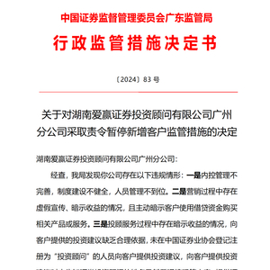 根据相关规定,广东证监局对湖南爱赢证券投资顾问有限公司广州分公司采取责令暂停新增客户的监督管理措施,并暂停新增客户6个月。