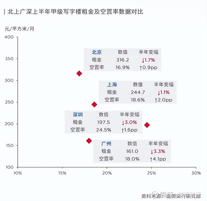上海大虹桥、北外滩的空置率,有的楼宇达到了50%。深圳甲级写字楼一季度空置率增加至27%%。