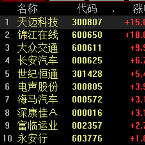 截至发稿,锦江在线、大众交通涨停,天迈科技、长安汽车、电声股份等跟涨。