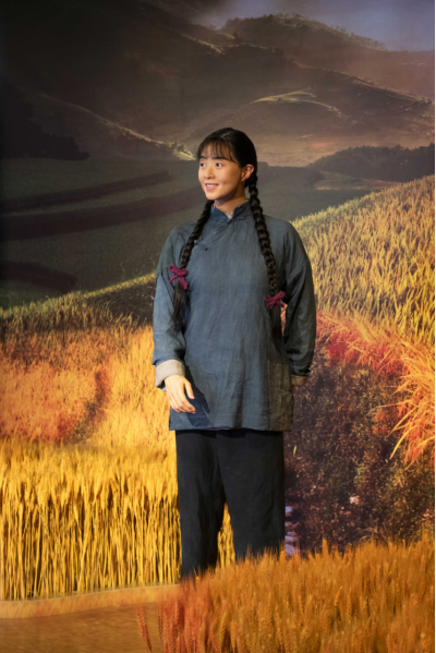 蜡像高度还原了电视剧《功勋》中申纪兰的形象——两条长长的麻花辫子搭在胸前,穿着卡其布蓝色上衣、黑色补丁长裤,小麦色的脸上洋溢着乐观坚定的笑容,深刻展现出申纪兰一生始终为人民谋利,带领农民“与天斗”的忠诚、执着、纯朴的理想信念。据悉,蜡像所着衣物全部为《功勋》中原戏服。该区域真实还原了一片麦田丰收的场景。金灿灿的小麦田,作为蒋欣蜡像的陈列场景。