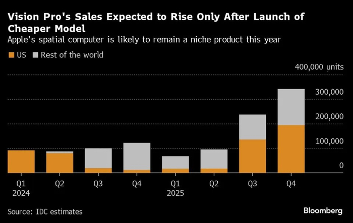 自这款电子产品于6月底在全球范围内推出后,美国以外地区的销量或将抵消美国市场的疲软。不过,IDC仍预计,苹果的Vision Pro今年的销量不会超过50万台。