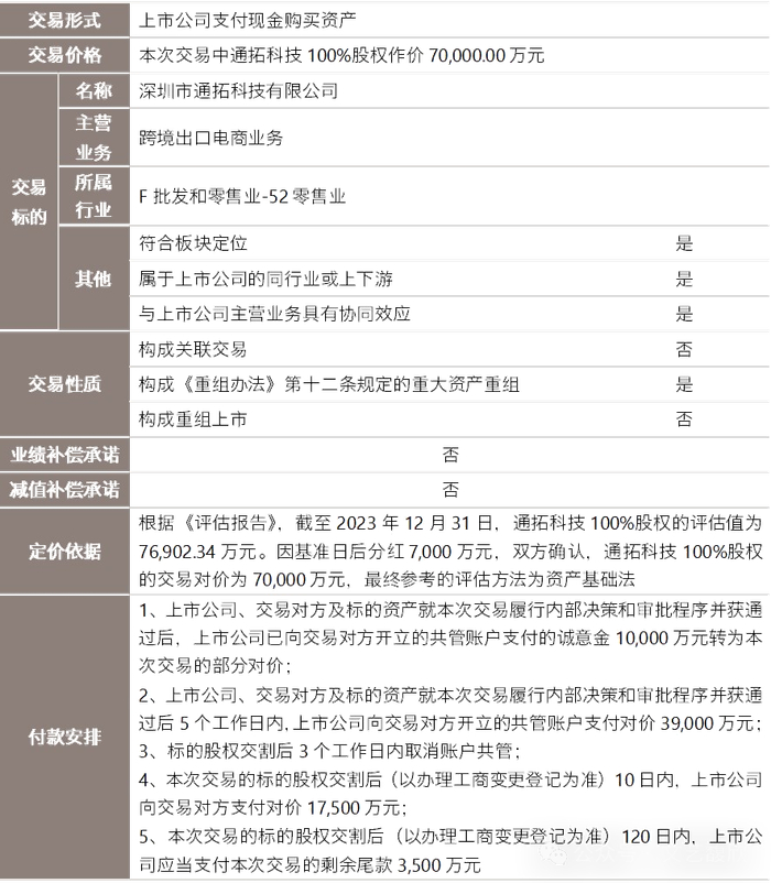 本次交易价格以通拓科技资产基础法评估结果作为定价依据。诚然,跨境电商并非重资产行业,此前的交易基本都是以收益法作为最终评估方法。2023年华凯易佰收购易佰网络10%少数股权时的评估报告里曾提及,资产基础法“未能包含表外且难以辨认的人力资源、客户资源、独特的盈利模式和管理模式、商誉等资产的价值,且以企业资产的再取得成本为出发点,有忽视企业整体获利能力的可能性”。此次对于未选择收益法的原因,公司在问询回复中解释:“本次并购属于同行业内的整合,双方在业务上有高度的相似性和互补性,主要目的在于直接获取通拓科技丰富的店铺资源、成熟的供应链体系、经验丰富的团队、高效的选品策略以及预期的协同效应价值。因此,评估重点为现有资产的实际价值和并购后整合所能带来的直接效益”。由于通拓科技此前持续亏损,若采用收益法评估,业绩预测的不确定性较高。而资产基础法评估结果7亿元交易作价相比此前华鼎股份收购通拓科技时的29亿元缩水了接近76%,算是挤出了估值“水分”。