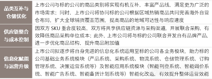 《国务院关于加强监管防范风险推动资本市场高质量发展的若干意见》(“新国九条”)鼓励上市公司围绕主业开展并购重组,本次交易属于横向整合并购,收购方在标的业务的经营以及后续整合上经验相对充分,因此相比于过往跨境电商行业的跨界重组来说更符合当前市场的监管导向。华凯易佰在《草案》中披露,双方将在多个层面上实现互补与协同:一是上市公司与标的资产的商品组合将实现有机互补,丰富产品线。同时,双方将完善海外仓储物流布局,扩大全球铺货覆盖;二是双方将共享供应链资源与渠道网络,开展联合采购,联合开发自有品牌产品;三是上市公司将运用自身信息化系统助力标的公司实现运营流程的自动化、智能化改造,提升整体运营效能。通拓科技目前有1万多家店铺,交易完成后,华凯易佰电商业务整体营收规模将接近百亿,行业地位会有较大提升,交易“商业合理性”相对清晰,是本次重大现金收购亏损资产方案推进的关键。