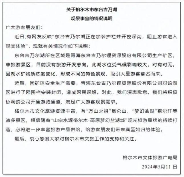 此前有被曝有网友曝光“东台吉乃尔湖正在加装护栏并开挖深沟,阻止游客进入观赏体验”。今年5月11日,青海格尔木市文体旅游广电局发布情况说明:近日,是因矿区安全生产需要,青海东台吉乃尔锂资源股份有限公司对该湖区进行了网围栏安装封闭,造成网民误解。对此,我们深表歉意。我们将积极协调该公司开通游览通道,满足广大游客观景需求。
