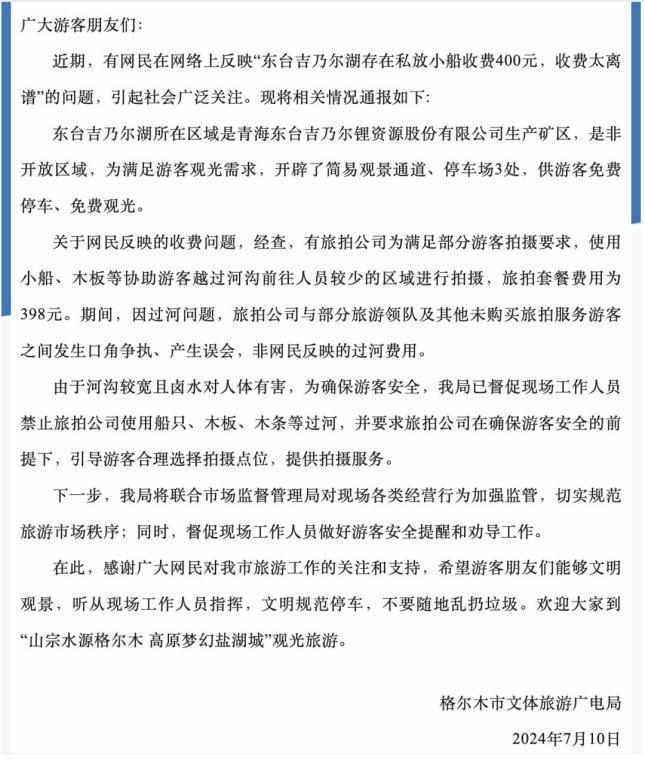 7月10日晚,格尔木文旅发布通报:近期,有网民在网络上反映“东台吉乃尔湖存在私放小船收费400元,收费太离谱”的问题,引起社会广泛关注。