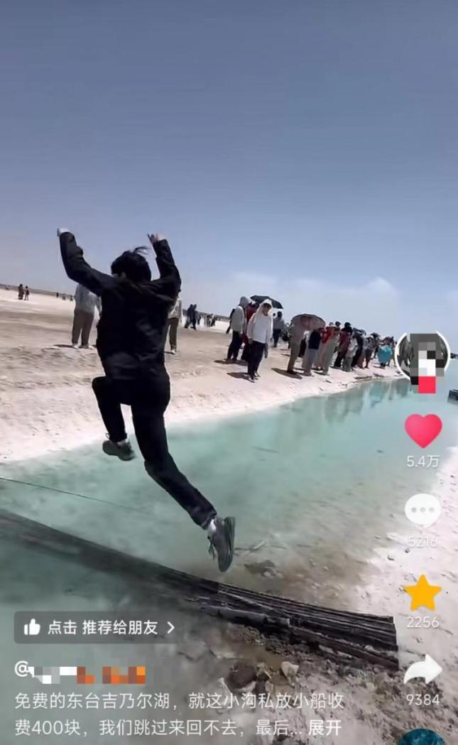 7月9日,有网友在某短视频平台透露,“免费的东台吉乃尔湖,就这小沟私放小船收费400块,我们跳过来回不去,最后找了个木板放这垫一下跳过来,最后还被人扔走,想钱想疯了。”