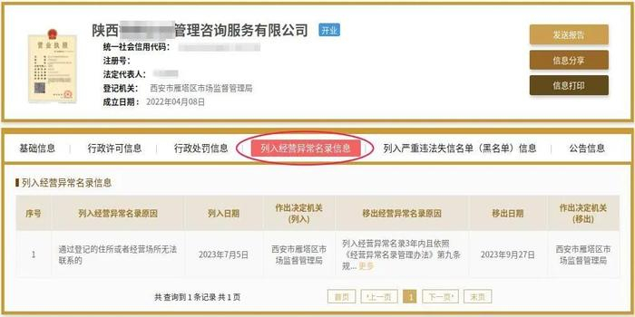 2.西安某管理咨询服务有限公司因经营需要,搬离登记经营场所,但未及时在其登记机关办理变更登记。2023年7月,雁塔区市场监管局检查中发现通过登记住所无法与该企业取得联系,于7月5日依法将其列入经营异常名录。企业在银行办理相关业务时受到了限制。企业随后办理了住所变更手续,并申请移出经营异常名录。