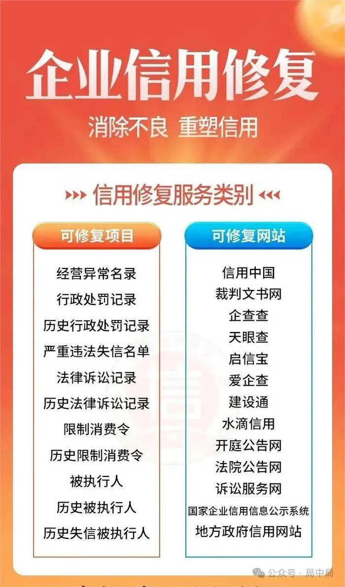 行政处罚,司法案件,裁判文书,开庭公告,历史被执行人等。以上列举的不良记录均可修复,需要企业提供基础材料、处罚决定书、缴费证明、完结证明等即可向相关部门申请修复。