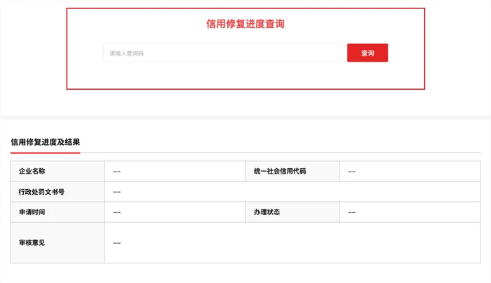 1.申请主体可通过短信中的“办理进度查询码”在线查看受理情况、审核进度以及审核结果。查询地址:(https://public.creditchina.gov.cn/htmls/repair3/repairSearch.html)