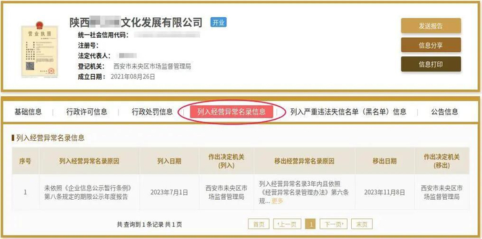 1.2023年7月1日,西安某文化发展有限责任公司因未按期公示2022年度报告,被未央区市场监管局列入经营异常名录。后期企业在参与一项重要招投标项目时,因存有经营异常名录记录从而未能通过资格审查。