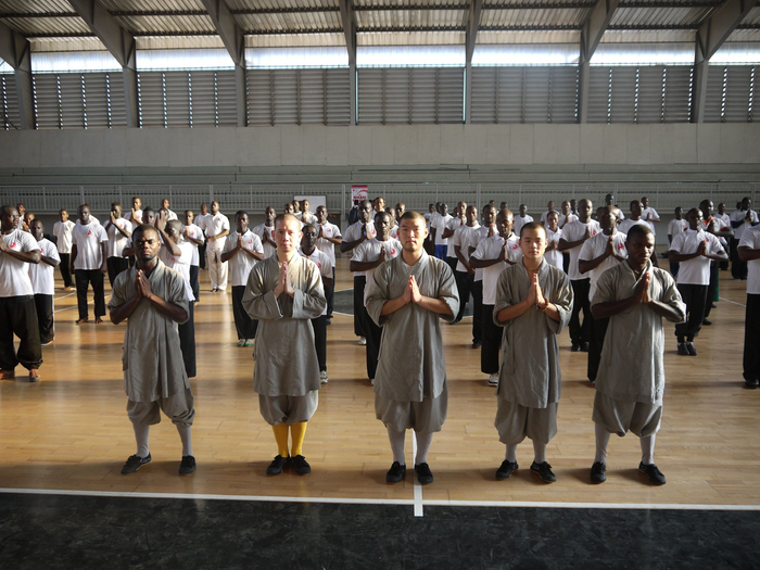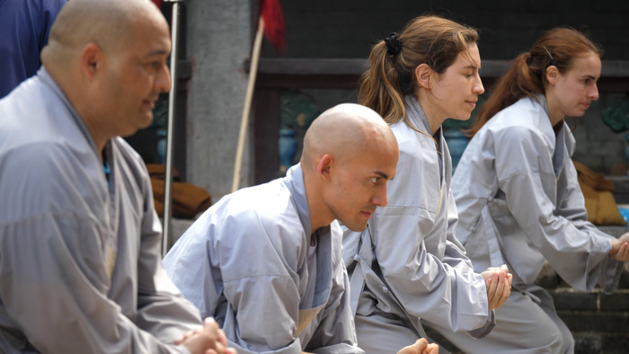 一套动作下来,刚柔并济,气势非凡。少林功夫非遗传承人释延岑耐心指导动作要领。