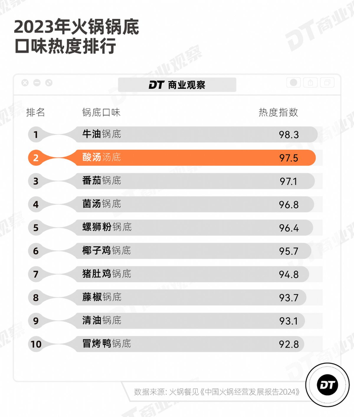 火锅餐见发布的《2024中国火锅经营发展报告》,在去年火锅锅底口味热度排行中,酸汤锅底排名第二,比火锅店常见的番茄锅底还要高,仅次于牛油锅底。