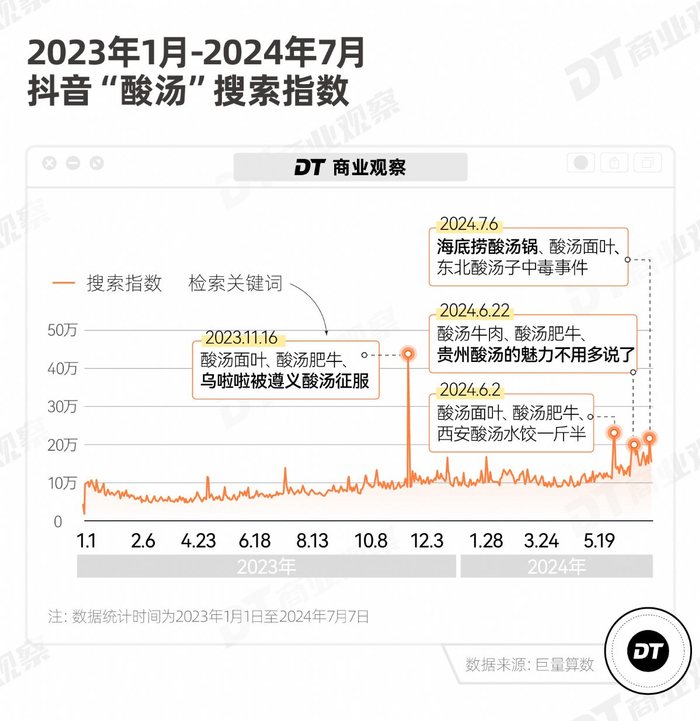 这股热潮并未就此平息,今年6月至7月期间,除了酸汤肥牛、酸汤面叶这些此前就被热议的话题,人们搜索的关键词还新增了西安酸汤水饺、贵州酸汤和海底捞的雷山酸汤锅新品。