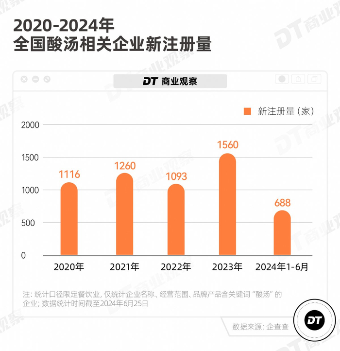 其实自2023年开始,餐饮市场上涌现了一批酸汤新品牌。根据企查查统计,2023年酸汤相关企业的新注册量达到了1560家,相比过去三年的新注册量都要多出超24%。