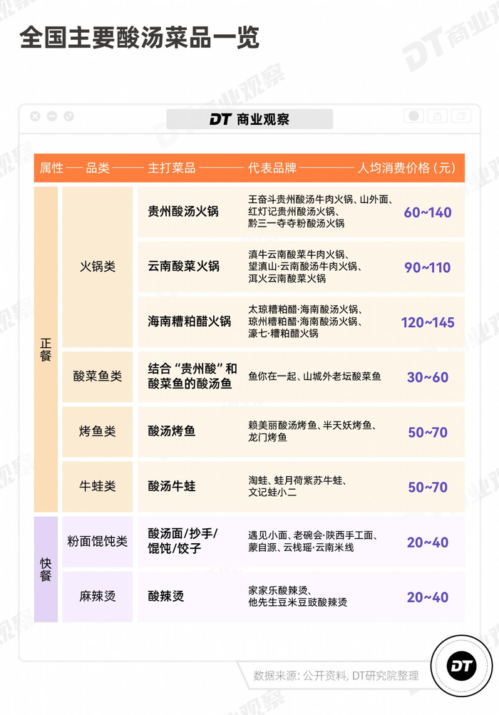 《DT商业观察》整理了市面上的酸汤菜品发现,很多本来就有汤底的菜品,都开始跟酸汤玩起了混搭,开发了不少新口味。