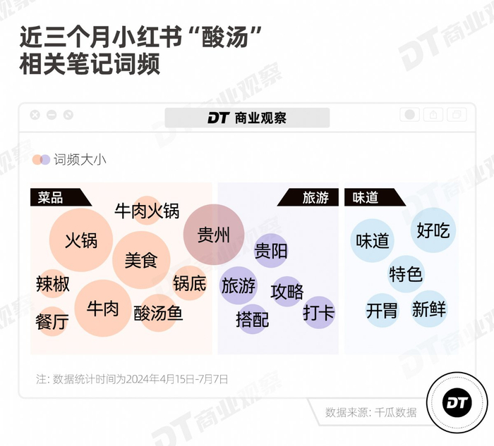小红书相关笔记的高频词验证了这一点,酸汤菜品被讨论较多的是贵州酸汤火锅和酸汤鱼,其中“好吃”“特色”“新鲜”“开胃”频繁地被年轻人所提及。