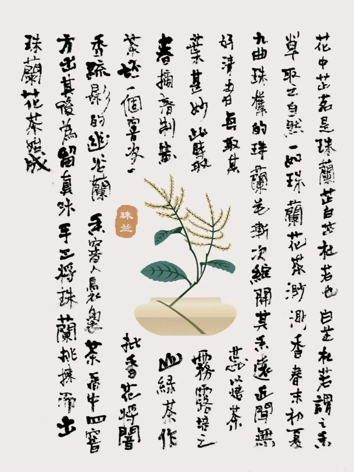 农谚中有一句节气饮茶的口诀,写作“冬喝红梅夏喝尖,二八月里喝珠兰。”属闲时饮的芳物珠兰茶,安放与二八月间,取其祛濡湿、暑湿之意。