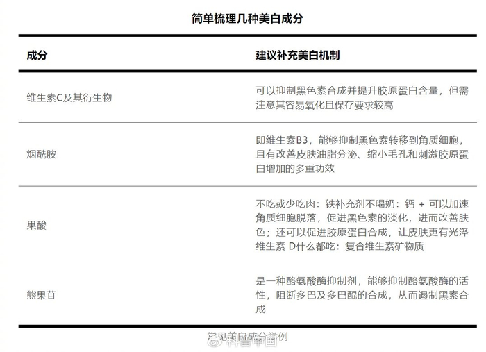 但类型是其次的,我们更强调成分要选择靠谱的。比较经典的外用美白成分有维生素 C 及其衍生物、烟酰胺、果酸、熊果苷等,美白产品的实际成分要比这多得多,就不一一赘述了。