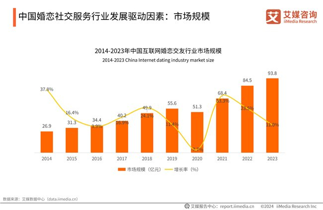 根据艾媒咨询发布的《2024—2025年中国婚恋社交服务市场研究报告》,中国婚恋社交服务市场规模自2014年以来持续增长,2023年已达到93。8亿元。这一增长态势不仅反映了市场需求的不断扩大,也预示着未来行业的广阔前景。