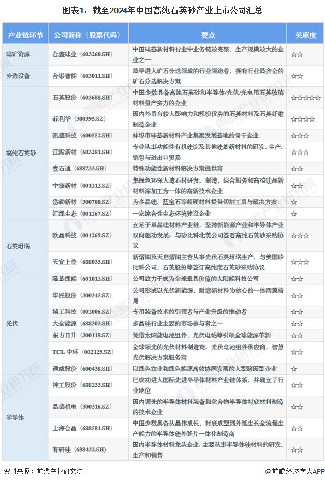 高纯石英砂是硅产业高端产品的物质基础。目前,我国高纯石英砂产业的上市公司主要分布在产业链下游光伏和半导体环节,布局中游高纯石英砂制造的企业近年来也有所上升。