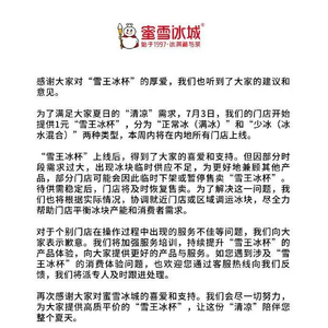 面对部分门店的“不配合”,蜜雪冰城今日的道歉信中明确指出,雪王冰杯本周内将在内地所有门店上线。如有部分门店冰块供应不足,将协调就近门店或区域调运冰块,以帮助门店平衡冰块产能和消费者需求。