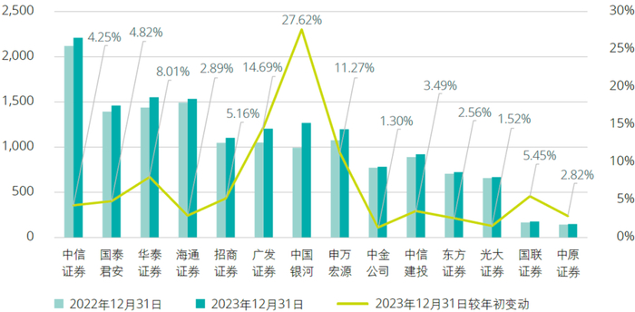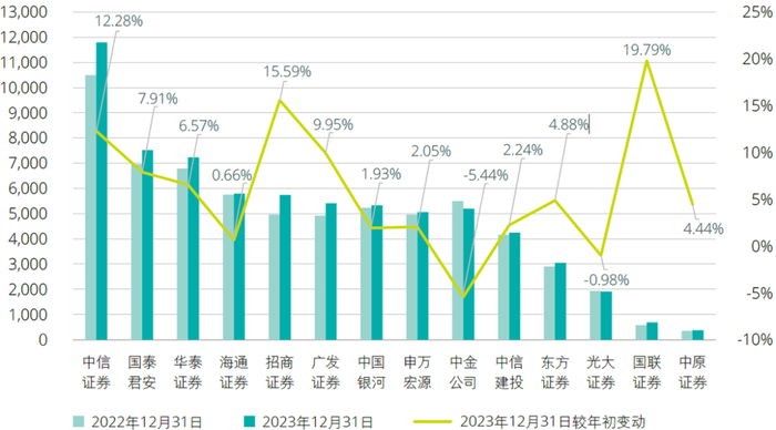 2023年证券行业持续提升资产质量、夯实资本实力。截至2023年12月31日,14家A+H股上市证券公司的资产总额为86,447亿元,较年初增长6.13%。充足的资本为证券公司业务转型升级和持续提升实体经济服务能力夯实了基础。