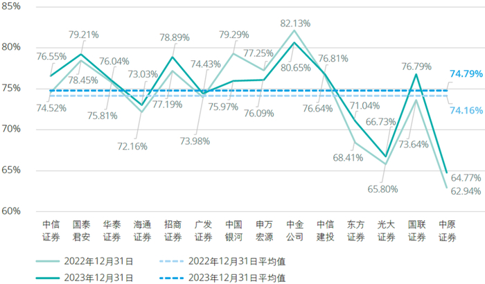 截至2023年12月31日,14家A+H股上市证券公司的资产负债率总体维持稳定,与上年末相比,呈现小幅上升趋势,平均资产负债率为74.79%,较上年末上升0.63个百分点。