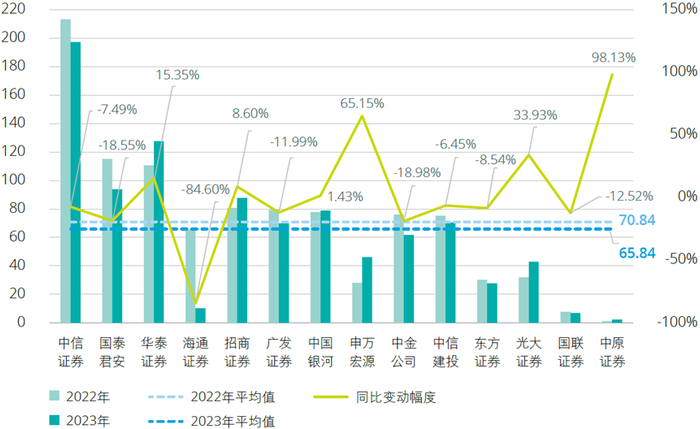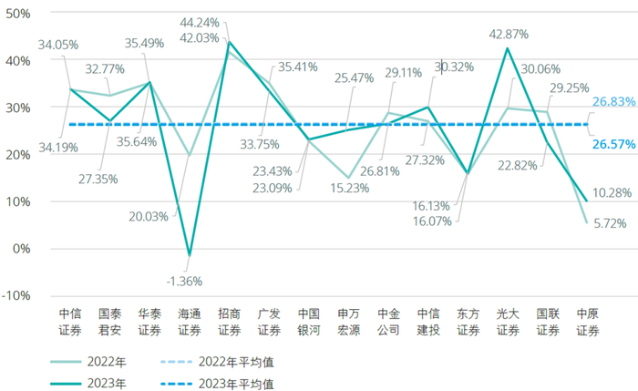 2023年,14家A+H股上市证券公司利润率(利润率=净利润/营业收入)平均为26.57%,较上年的26.83%基本持平。利润率排名前三的证券公司分别为招商证券(44.24%)、光大证券(42.87%)以及华泰证券(35.64%)。