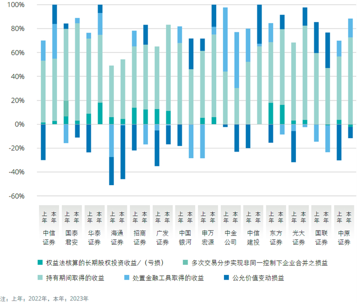 无论是2022年还是2023年,14家A+H股上市证券公司持有期间取得的投资收益均为盈利状态,投资收益的亏损主要来自于处置金融工具和公允价值变动。14家A+H股上市证券公司所持有的金融工具中债券占比较大,2023年中国债券市场主要指数多数上涨,因此2023年14家A+H股上市证券公司多数因处置金融工具和公允价值变动而获得收益,仅少数因此导致亏损。