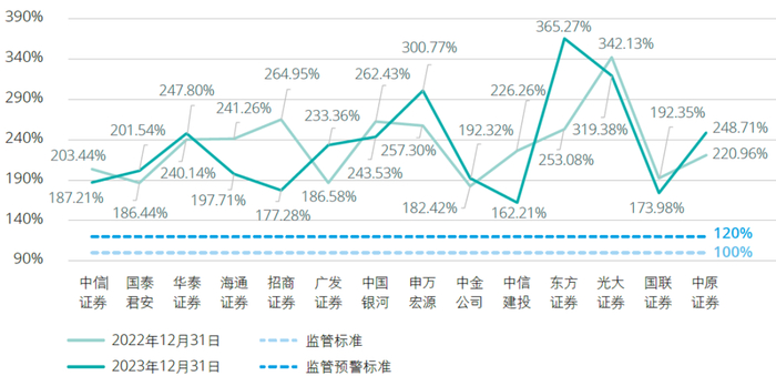 根据风控办法的要求,证券公司风险覆盖率不得低于100%,预警线为120%。截至2023年12月31日,14家A+H股上市证券公司的风险覆盖率距离监管要求的最低水平均留有较宽的缓冲垫。其中,共有8家证券公司的风险覆盖率在200%以上。