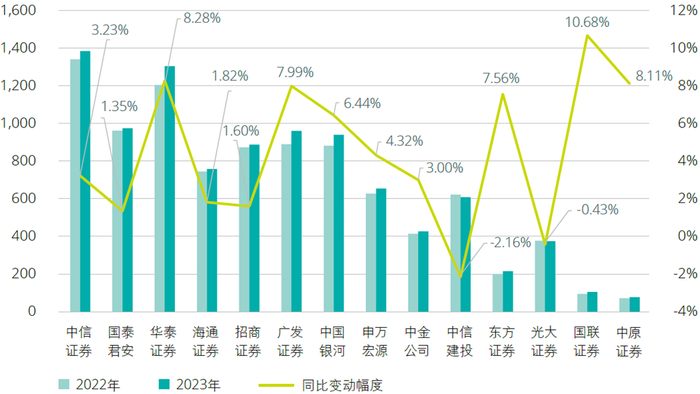 2023年,14家A+H股上市证券公司利润率整体水平略有提升,其中有9家利润率同比增长。资产规模相对较小的证券公司利润率总体实现增长,如光大证券和中原证券增幅显著,分别增加42.61%和79.72%。资产规模排名相对靠前的证券公司利润率处于行业领先水平,相较上年略有增长,但海通证券和国泰君安降幅较大。受资本市场波动加大、手续费及佣金净收入增长乏力以及利息支出增加影响,部分证券公司利润率一定程度下滑。