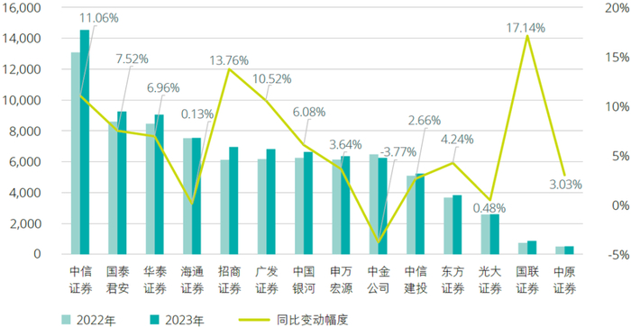 2023年,14家A+H股上市证券公司实现归属于母公司股东的净利润总额合计921.79亿元,其中超过50亿元的证券公司为8家。中信证券、华泰证券、国泰君安的归属于母公司股东净利润位列前三甲,分别为197.21亿元、127.51亿元及93.74亿元。在14家A+H股上市证券公司中,有8家归属于母公司股东的净利润同比下降;其余6家证券公司实现增长,其中3家增幅超过20%,分别为中原证券(98.13%)、申万宏源(65.15%)及光大证券(33.93%)。