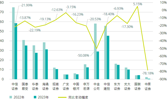 在证券承销收入方面,2023年,14家A+H股上市证券公司证券承销收入合计289.74亿元,同比下降23.16%。其中,中信证券以58.54亿元的证券承销收入位居第一,同比下降21.99%,中信建投、国泰君安、海通证券和中金公司分别以45.40亿元、35.22亿元、31.16亿元和28.99亿元的证券承销收入排名第二至五名,较上年同期均有不同幅度的下滑。