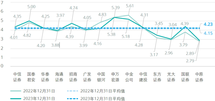 截至2023年12月31日,14家A+H股上市证券公司经营杠杆率呈小幅上升趋势。14家A+H股上市证券公司平均经营杠杆率为4.23倍,较上年末增加0.08倍。