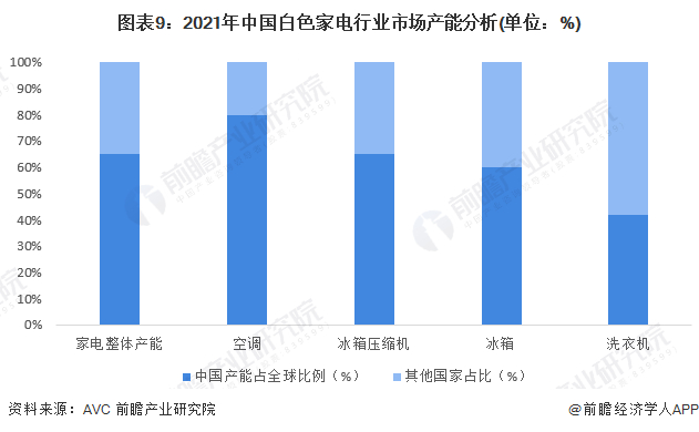 根据相关数据显示,中国白色家电产能水平较高,以空调、冰箱、洗衣机为主要代表的白色家电产品全球产能占比区间在42%-80%。其中,空调全球产能最高,达到了80%;其次为冰箱,占比为60%;再次为洗衣机,产能占比为42%。