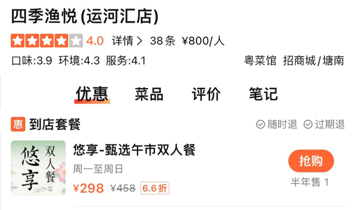 人均800块的精致粤菜“四季渔悦”,双人餐298,算下来人均还不到150。