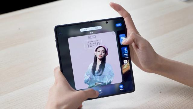 智慧摆台在Magic V3上也有了不一样的玩法,比如我们可以无需支架将Magic V3直接悬停摆放在桌面上即可触发智慧摆台,并且可以自定义显示的图片或者是放上自己正在追的电视剧卡片。