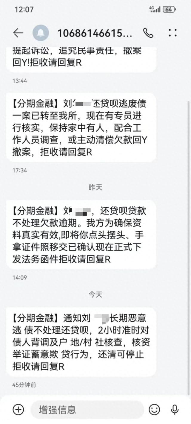 中午11点多,他又收到该106开头的号码发来的信息,“【分期金融】刘某某,还贷呗欠款沟通后仍拒还,资料已核实完毕,现将出发到平台预留地址,全额收缴并联合当地村(居)委陪同全款清收,拒收请回复R。”