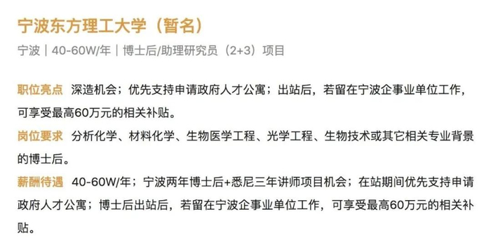 《21CBR》记者注意到,该校已释放多个招聘岗位,面向博士后/助理研究员,开出40万-60万元年薪。