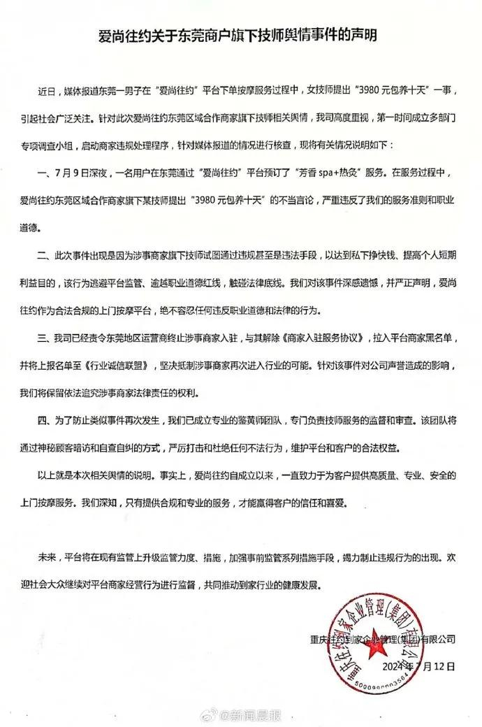 7月12日,爱尚往约到家平台官微发布关于东莞商户旗下技师舆情事件的声明:近日,媒体报道东莞一男子在“爱尚往约”平台下单按摩服务过程中,女技师提出“3980 元包养十天”一事引起社会广泛关注,针对此次爱尚往约东莞区域合作商家旗下技师相关舆情,我司高度重视,第一时间成立多部门专项调查小组,针对媒体报道的况进行核查,启动商家违规处理程序,已责令终止涉事商家入驻与其解除协议,拉入平台黑名单。
