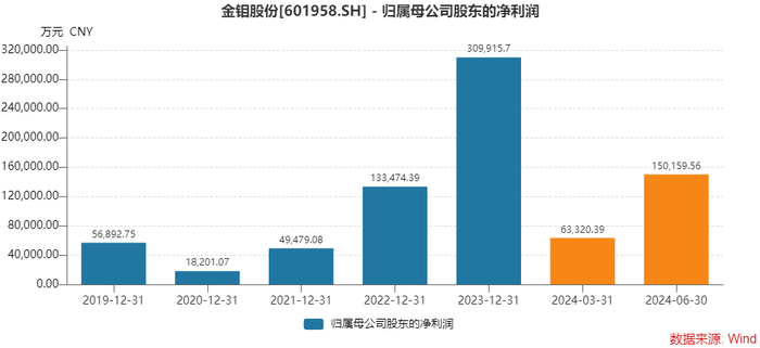 金钼股份2021年至2023年归母净利润分别为4.95亿元、13.35亿元和30.99亿元,同比增幅分别约172%、170%和132%。