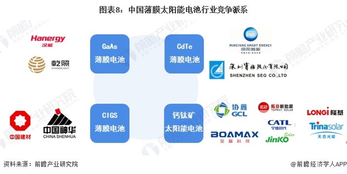 我国薄膜太阳能电池行业上市公司主要有深赛格、明阳智能、隆基绿能、协鑫集成等企业,从竞争派系来看,行业根据产量可分为四个派系,分别是GaAs、CdTe、CIGS与钙钛矿电池。