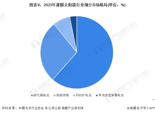 根据中国光伏行业协会及各上市企业公报数据综合测算,2023年,我国薄膜太阳能电池市场中,碲化镉电池市场占比最高,超过60%,其次为CIGS电池。近年来,钙钛矿电池受到行业推崇,但由于产业化程度较低,因此占比仍十分有限。