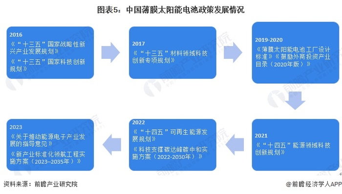 薄膜太阳能电池作为新型太阳能电池,具有高转换效率、低成本、应用场景广泛等优势,契合光伏行业降本增效的主旋律,获得了国家的认可。近年来,国家层面出台相关政策推动薄膜电池产业发展,相关行业政策具体如下: