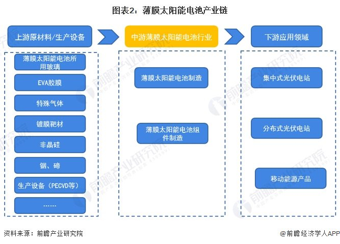薄膜电池行业在最近几年逐渐形成规模,不论技术水平、行业成熟度、供应链等均处于逐渐成熟的过程中。从产业链来看,薄膜太阳能电池产业链一般包括电池原材料和生产设备、薄膜太阳能电池制造、薄膜太阳能电池组件制造以及薄膜太阳能电站等应用。其产业链如下图所示: