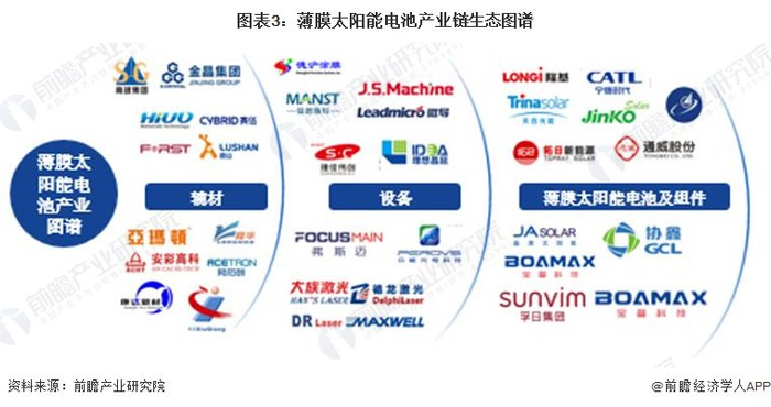 从薄膜太阳能电池产业链参与者来看,代表性企业主要分布在产业链上游和中游。上游辅材供应商包括安彩高科、亚玛顿、秀强股份、隆华科技、阿石创、海优新材、明冠新材、康达新材等,设备供应商包括捷佳伟创、京山轻机、微导纳米、理想晶延、红太阳、众能光电、奥来德、德沪涂膜、曼恩斯特、大族激光、迈为股份、帝尔激光、弗斯迈等;中国薄膜太阳能电池及组件制造商包括协鑫光电、宁德时代、隆基绿能、晶科能源、宝馨科技等。