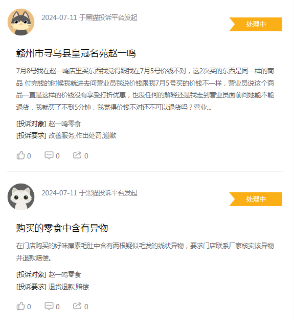 但在黑猫投诉平台,仍有221条投诉针对零食很忙,299条针对赵一鸣零食,投诉多涉及出现异物、变质等原因,最新一则为7月11日投诉赵一鸣零食的“素毛肚中有疑似毛发的线状异物”,目前仍在处理中。
