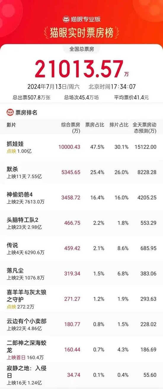 今日,沈腾马丽合体新作《抓娃娃》开启点映,相关词条迅速冲上微博热搜。票房方面,猫眼专业版数据显示,截至7月13日17时34分,《抓娃娃》票房已破亿。