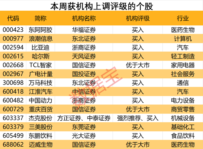 本周14股获得券商机构上调评级,其中浪潮信息获东北证券上调至“买入”评级。